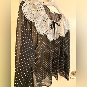 Elegant black blouse featuring intricate white lace detailing. Perfect for adding a touch of sophistication to any outfit.