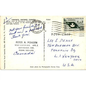 Experience the breathtaking aerial view of downtown Toronto, Ontario, with this stunning postcard capturing the vibrant skyline looking east toward the harbor. The postcard showcases iconic landmarks the bustling waterfront, and the dynamic blend of urban life and natural beauty.