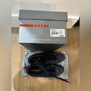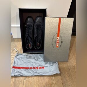 Elevate your look with these Prada black leather sneakers. Sleek design with premium craftsmanship. In a very good condition.