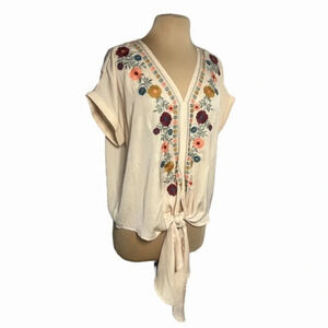 Entro floral embroidered boho cap sleeve top tie front size M