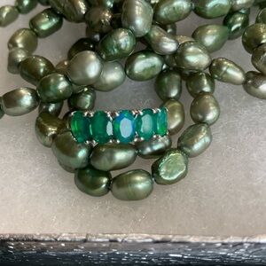 Elegant silver ring featuring stunning green opal stones. Perfect for adding a touch of sophistication to any outfit.