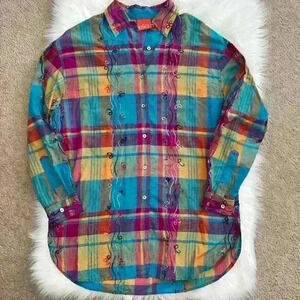 Rainbow plaid. Mother of pearl buttons. Rainbow embroidery with swirls and floral like details. Rounded bottom hem. No flaws. Soft and comfortable - very light. Slightly sheer. Longer cut. Perfect with leggings or as a popover.
