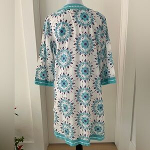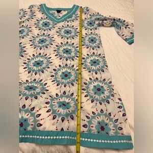 La Lingerie 100% cotton tunic in white with a multi colour mandala pattern and blue borders with white embroidery around neckline, hem, and sleeve. Side slits, 3/4 sleeves and V Neck. Fabric is on the sheer side. Wear this as a nightgown or a beach coverup.
