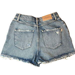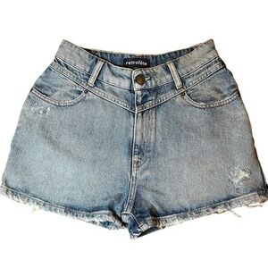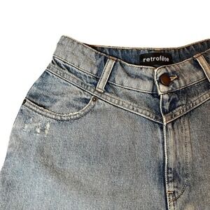 Retrofête Shorts Blue Mid Rise Med Wash Distressed Accents Slit Pockets Size 26