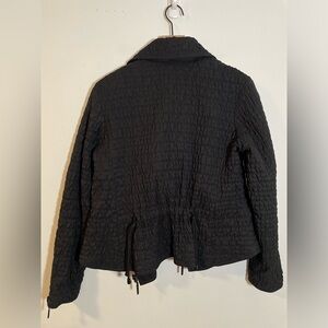 One side is a textured quilted style and the other is smooth. Crossover double zip moto style. Short length. Long sleeves with zippers on cuff of sleeves. Pockets inside and out. Two Ties in back for cinched fit on textured side.