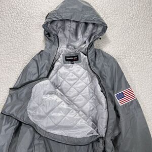 This Members Only Sport jacket features a modern anorak-style pullover design with a dual zip entry, insulated quilted lining, and a streamlined gray shell. The jacket is finished with a NASA space shuttle patch on the sleeve, a USA flag patch, and a bold Members Only chest hit, giving it a clean streetwear-meets-techwear look.