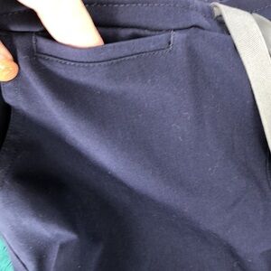 Preowned. No flaws. Total of 10 pockets. Eight in front and two in back. Pocket on right leg zips.