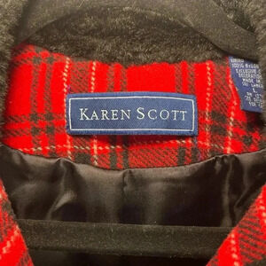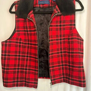 Elevate your winter wardrobe with this Karen Scott vest. The multicolor plaid pattern and faux fur collar make it perfect for the holiday season or casual wear. The full zip closure and lightweight design make it easy to wear for travel or everyday outfits. This vest is made of a wool blend outer shell and lined with nylon for added comfort. The vest is a size L and has a waist length coat/jacket style. The accents of a zipper and faux fur trim add a touch of style to this vest. Get ready to embrace the winter season with this fashionable and versatile vest from Karen Scott.