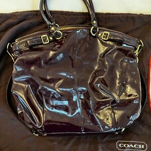 Very good condition Coach plum patent leather shoulder bag with gold hardware. Dust bag included. Can also be used cross body. Gorgeous plum color. Minor scuffs as shown in picture. Perfect for everyday or a night out. Non smoker/smoke free home!