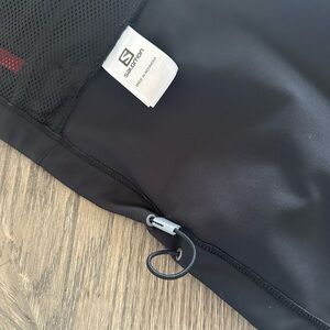 Experience comfort and style with this Salomon jacket. Black design with bold red highlights. Ideal for active wear. Note: the stitching on the left, back shoulder is a little rough.