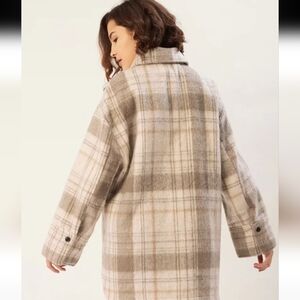Beige checked tailored jacket with, has a spread collar, 2 pockets, has a button closure, long sleeves, straight hemline, polyester lining engineered with 88% polyester, 12% wool.