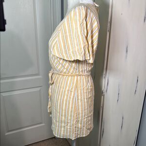Stay cool and stylish in this effortlessly chic romper by Altar’d State! This piece features a flattering wrap-front V-neckline, short flutter sleeves, and an elastic waist with an adjustable tie belt for the perfect fit. The soft yellow, white, and gray vertical stripes elongate your silhouette, while the lightweight fabric makes it ideal for warm-weather days. Size small