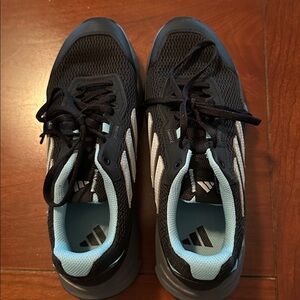 Size 8.5 Adidas Womens black design with light gray strip. Comfortable and stylish. Ideal for daily wear. Only worn for about 30 minutes!!