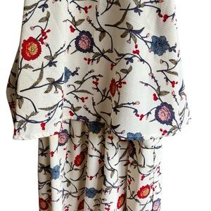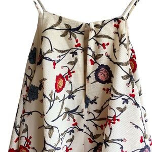 Chic mini dress by Lush. Features a floral pattern. Cream background with multicolor floral print with tones of red and blue. Perfect for casual outings. Back keyhole accent. Partially lined. Lightweight flowy construction perfect for spring summer events.