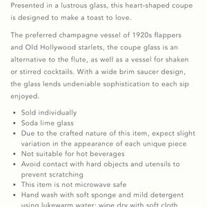 The preferred champagne vessel of the 1920's Flappers and old Hollywood Starlets, the coupe glass is an alternative to the flute as well as a vessel for shaken or stirred cocktails. With a wide brim saucer design, the glass lends undeniable sophistication to each sip enjoyed.
