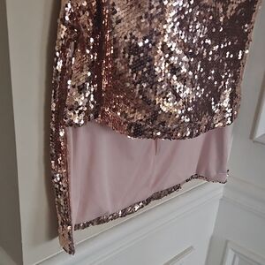 Eye-catching gold sequin dress. Ideal for glamorous events. Has some stretch and yhe straps are adjustable. See measurements.