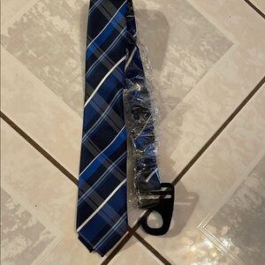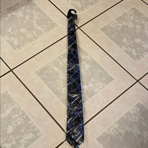 This elegant necktie features a striking combination of blue and black stripes, crafted with a smooth, silky texture. Its classic design makes it a versatile accessory for any formal occasion, adding a touch of sophistication to your ensemble. New no tags#118