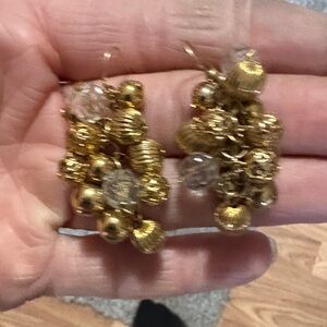 VINTAGE 70s CLUSTERED GOLD-TONE AND CLEAR BEADED DANGLE HOOK 1.8" EARRINGS