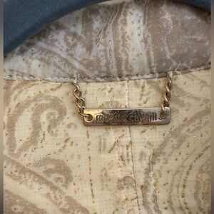 Vintage Roberto Cavalli jacket. Yellow, beige & white. Very soft and lightweight fabric. Hook & eye closure. Slight hombré coloring from soft yellow to lighter yellow at bottom.