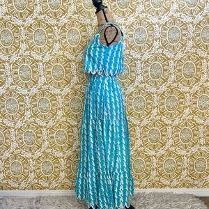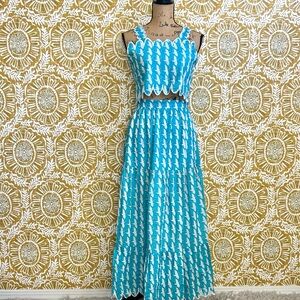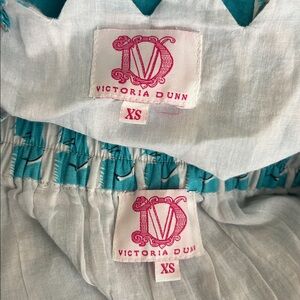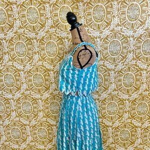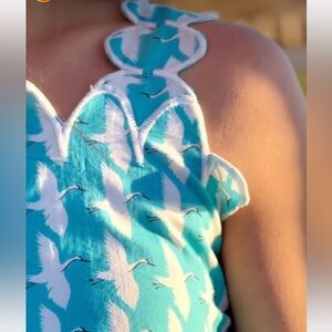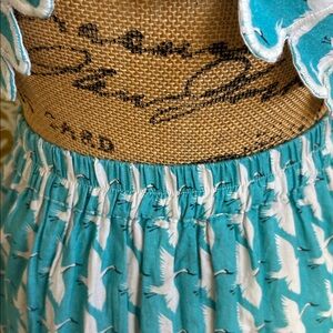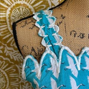 Victoria Dunn Lupine Scalloped Cotton Top/Skirt Set in Turquoise Blue and White Allover Crane Print. Size XS, in great condition. Very rare, sold out everywhere print.