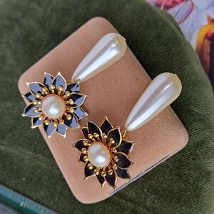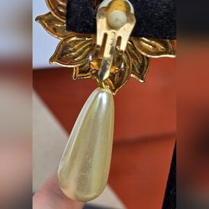 Vintage Black Gold Metal Floral Drop Fuax Pearl Clip On Earrings