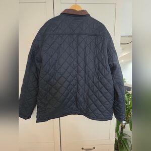 Navy quilted jacket with a stylish brown collar. Features front pockets and a full zip closure.