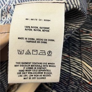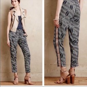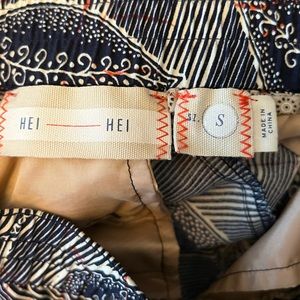In excellent gently used condition Womens size small HEI HEI from Anthropologie Womens navy, red, and white leaf print pants with pink, white, and navy ribbon detail running down side of leg. In excellent gently used condition with no holes, no rips, no stains noted. Waist runs slightly large for a small in my opinion- please note measurements!!