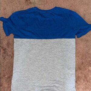 Stylish short sleeve tee. Blue top with gray bottom. Features a striking orange pocket.