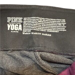 These black leggings from PINK Victoria's Secret are designed with a wide waistband for comfort and a striking 'PINK' logo down the leg. Crafted from a stretchy material, they offer a snug fit ideal for both athletic activities and casual outings. Measurements: Inseam 28", Waist 29", Hips 30". Comes From a Smoke and Pet Free Home