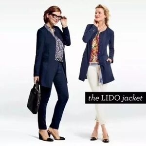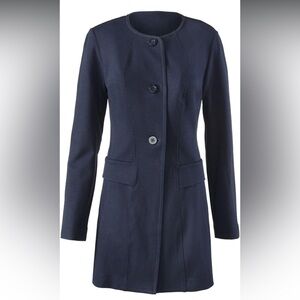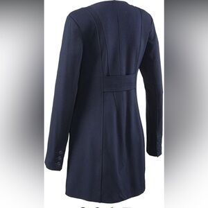 Cabi Lido Knit Jacket Navy Blue Button Up Mid-Length Coat Size M. Very good preowned condition! No rips, holes, or stains. Button cuffs. Button up. Front pockets. Knit material so stretchy and flexible.