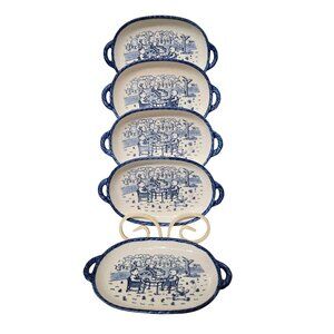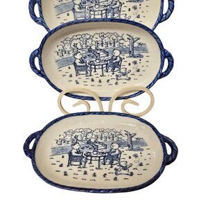 These ceramic serving trays by Chulkiart feature a charming hand-painted bear picnic scene in blue. Durable and ideal for serving or decorative use.