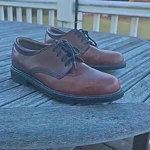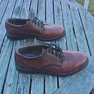 1. Presenting a pair of Bass derby oxford shoes in a rich brown hue, elegantly displayed on a rustic wooden table. Designed for both comfort and style, these size ten shoes feature a classic silhouette that complements various outfits, making them a versatile addition to any wardrobe. The quality craftsmanship ensures durability, while the timeless design offers a sophisticated touch for both casual and formal occasions.