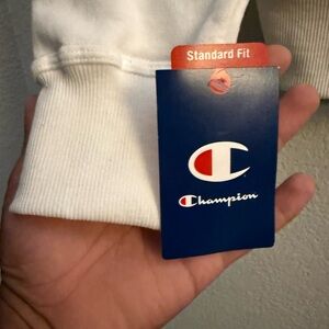 Classic white hoodie with iconic Champion logo. Comfortable and stylish for everyday wear.