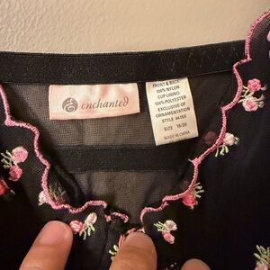 Stunning vintage-style "Enchanted" brand babydoll chemise. Features a sheer black mesh body with delicate pink floral embroidery and a satin ribbon bow detail under the bust. Scalloped trim and adjustable straps for the perfect fit. Perfect for a coquette, cottagecore, or whimsigoth aesthetic.