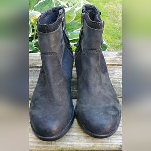 Stylish black ankle boots. Features buckle and zipper accents. Durable and versatile design.
