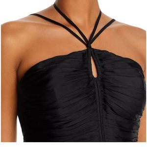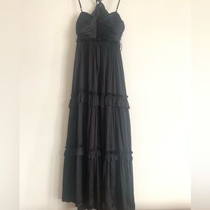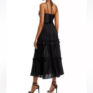 Elegant black midi dress by Aqua. Features a halter neckline and tiered skirt. Perfect for evening wear.