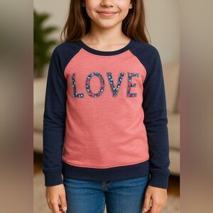 Adorable Cherokee girls long sleeve raglan top in a pretty coral pink with navy sleeves and floral “LOVE” applique across the chest.