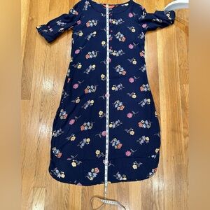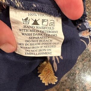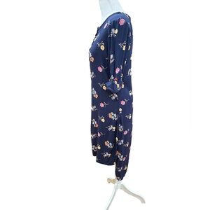 This elegant long sleeve dress features a beautiful floral pattern on a navy background. See photos for measurements has a lower front hem of 35 inches, back length is 39 inches.