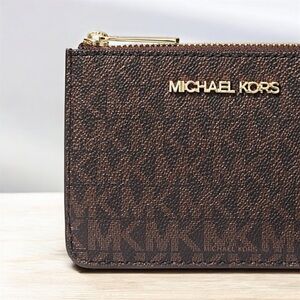 Elegant tan card holder by Michael Kors. Includes card slots and a convenient key ring.