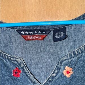 Stylish denim dress with vibrant floral embroidery. Can also be worn with a top underneath so it’s more appropriate for weather or settings. Perfect for casual outings. %100 cotton, made in India and believed to be made by Apago Collection. I noticed a few spots when listing as shown in photos, pricing accordingly.