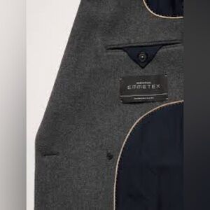 Stylish gray pea coat. Double-breasted design. Perfect for a classic look.