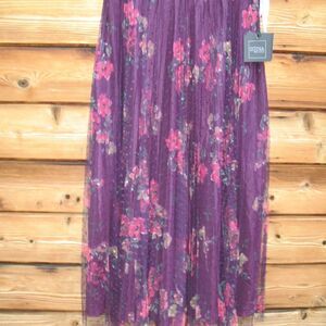 Plum floral tea-length dress with flutter sleeves and sheer insets at the shoulder.