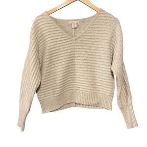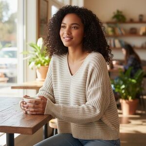 Elegant V-neck sweater. Soft and comfortable for everyday wear. Beautiful oatmeal/tan coloring. Extremely soft & warm 🥰