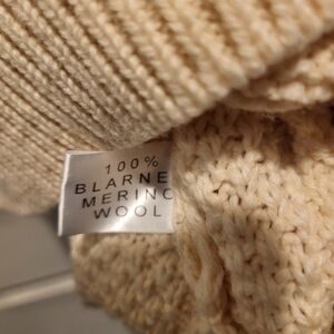 Benefits Charity! Blarney's Cable Knit Aran Cream Merino Wool Poncho/Cape with buckle details. Beautiful Cable Knit design with unique leather buckle. Perfectly cozy fir a cold winter day! 26" across chest and 32" from shoulder to hem