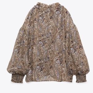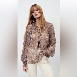Zara Women Size M Blouse V Neck Long Sleeve Ruffle Sheer Top Paisley Tassels