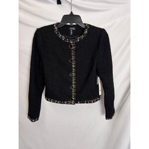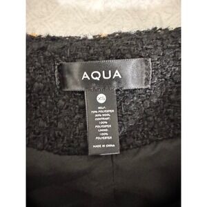 Keywords: AQUA, tweed jacket, black blazer, cropped jacket, career jacket, button front, womens jacket, formal jacket, business casual, collarless jacket, classic jacket, designer jacket, petite jacket, size XS