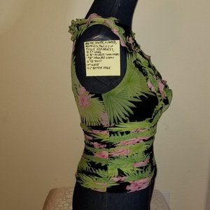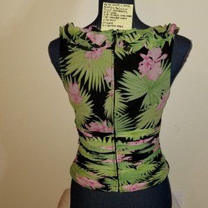 #695 NWOT RARE Kay Unger New York Ruffled Ruched Silk Green Palm Leafs Black Pink Orchid Top, sz. 4, fully Lined, OBO!