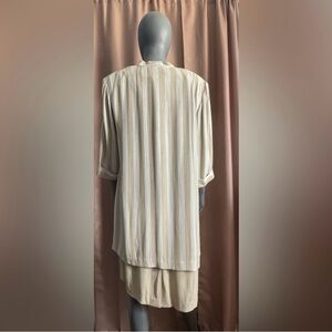 R & M Richards two-piece dress and jacket set with vertical stripes in neutral colors like cream, beige, and light brown. The dress is a sleeveless, knee-length sheath, and the coordinating jacket is open-front with three-quarter length sleeves, featuring a pleated or crinkle-knit texture