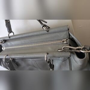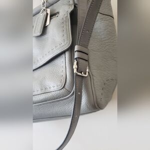 Coach Pinnacle Louisa Pebbled Leather Bag 18973 2011- Gray. Front flap has a pouch that can be closed by a zipper. Detachable strap included. Under front flap, there is another pouch. Main compartment can be close by a zipper. Back side also has another pouch that can be closed by a zipper. Inside soft lining is gray. Inside has a pouch that can be closed by a zipper. Inside also has another two open top pouch. Metal buckles. Elegant tag with Coach brand. Outside has decorative stitchings. All zippers in working condition.