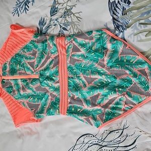 Girls Bathing Suit, Coral Palm One Piece, Size XL 14/16